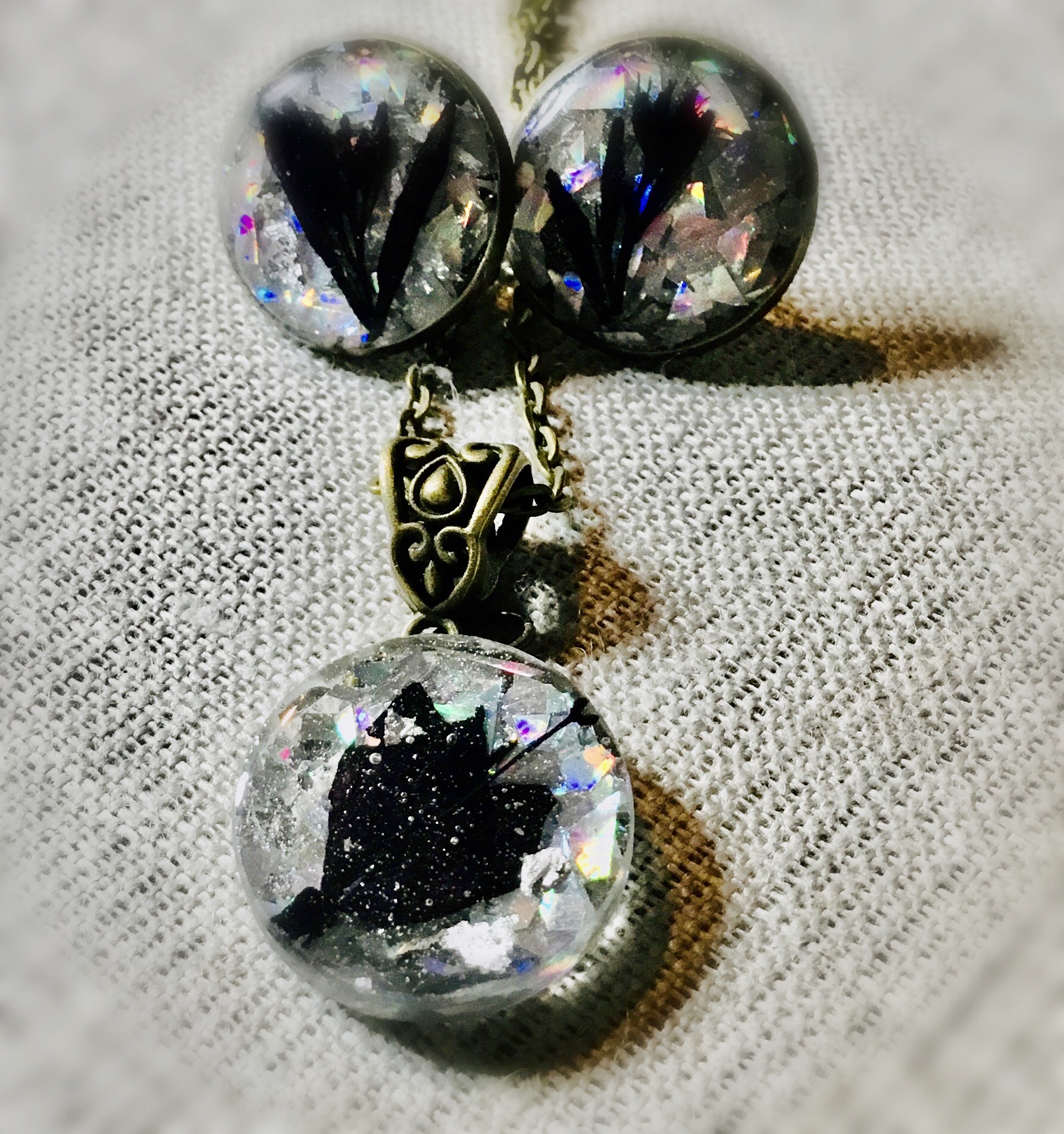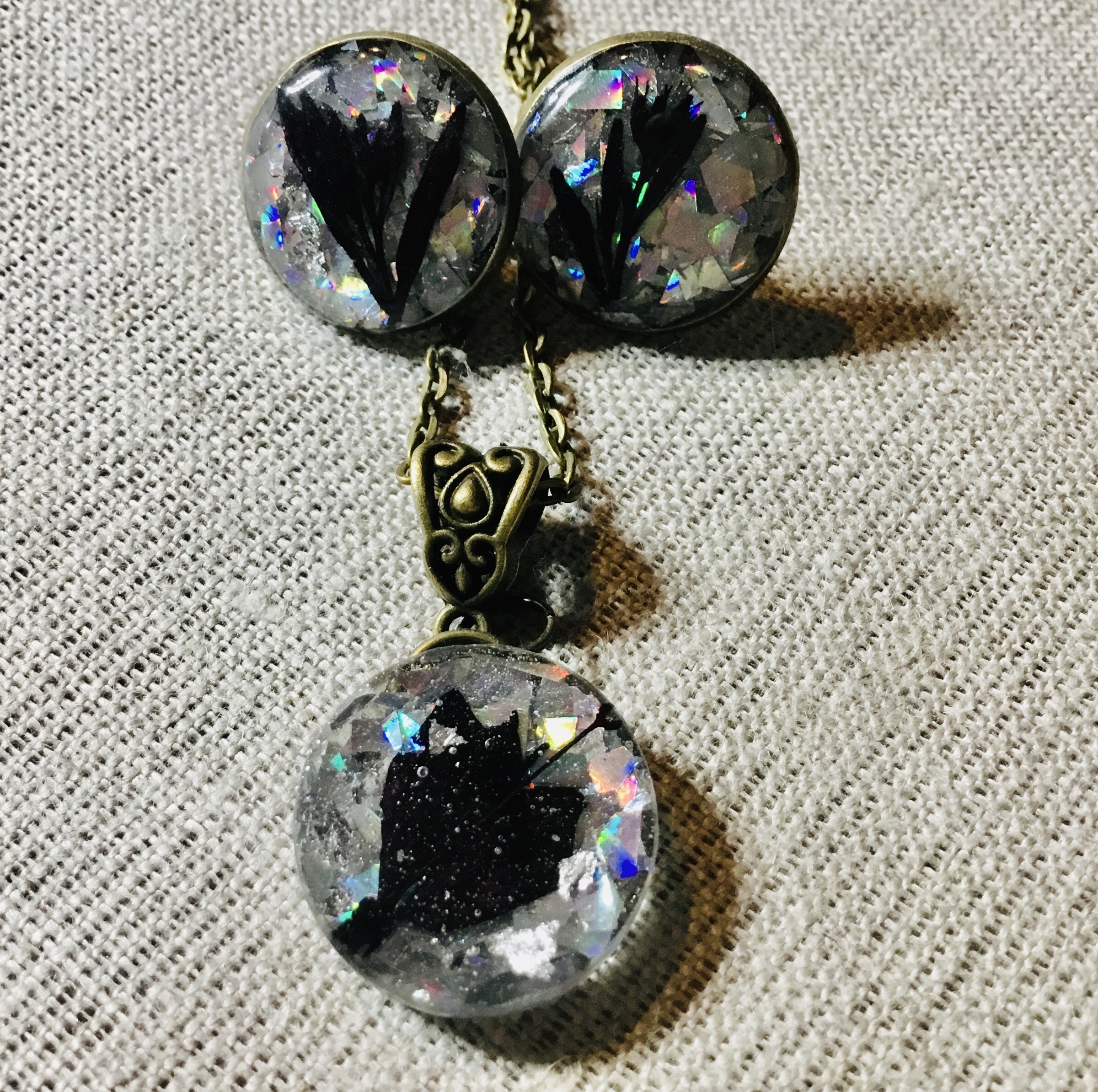 Step into nature’s quiet mystery with this dazzling handmade jewelry set, featuring a real black dried flower elegantly suspended in crystal-clear resin, dusted with a soft glitter shimmer that catches the light like morning dew. The result is a captivating, gemstone-like sparkle that feels both organic and magical.