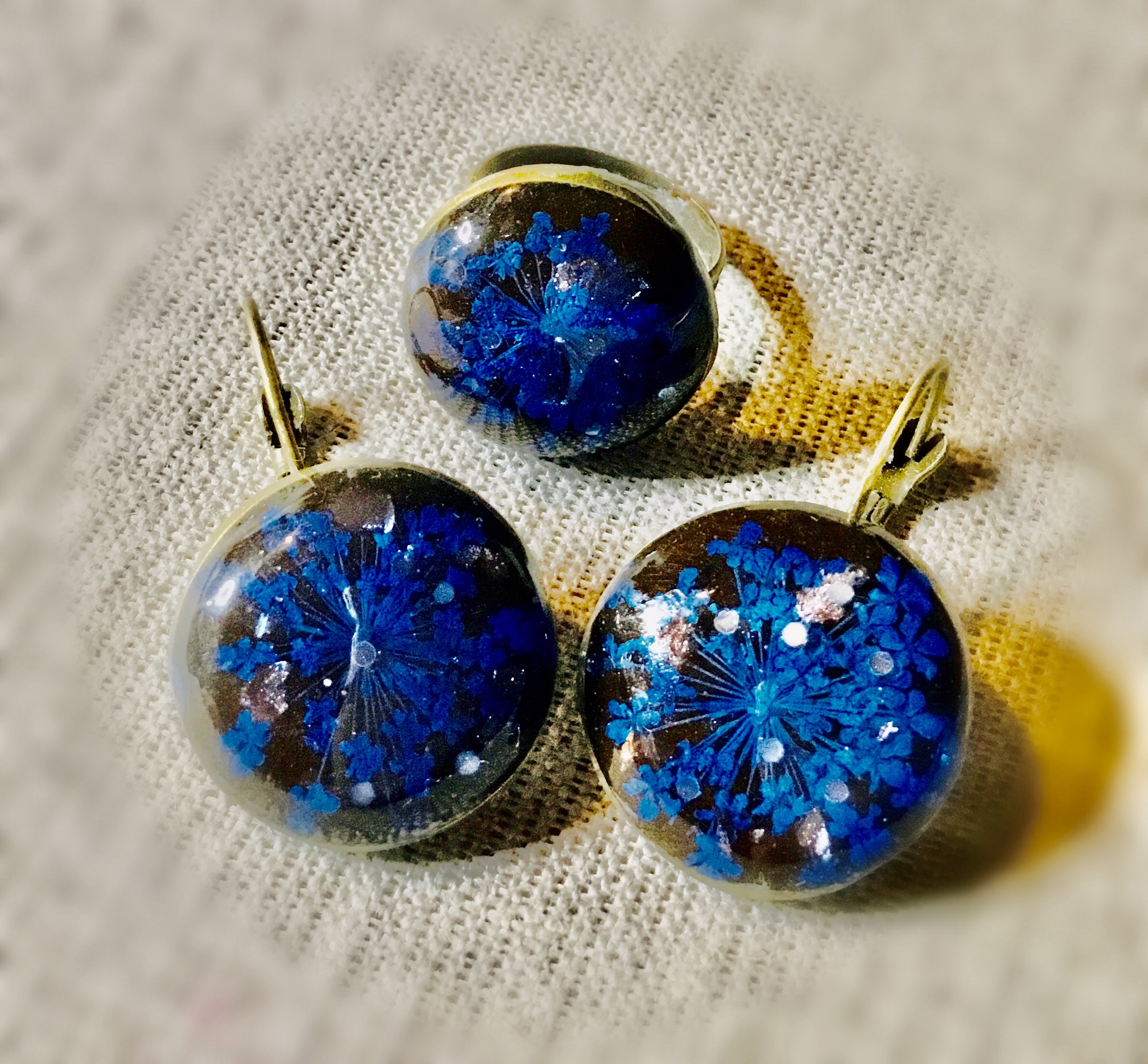 Blue Queen Anne’s Lace Jewelry Set – Real Flower Resin Earrings & Ring