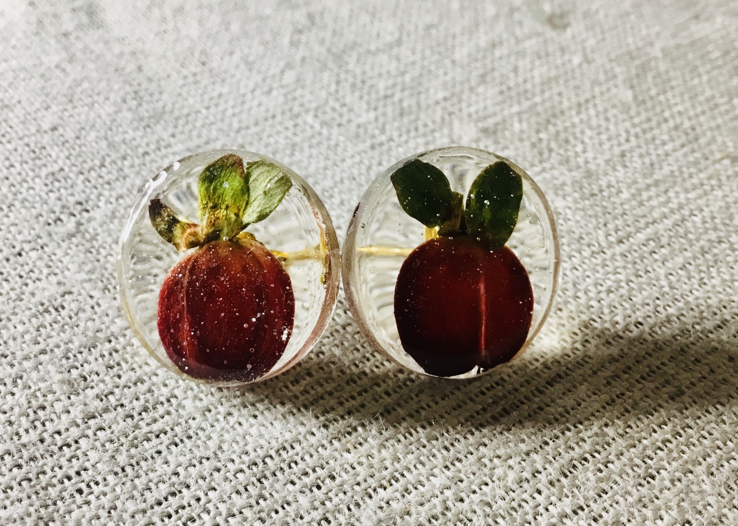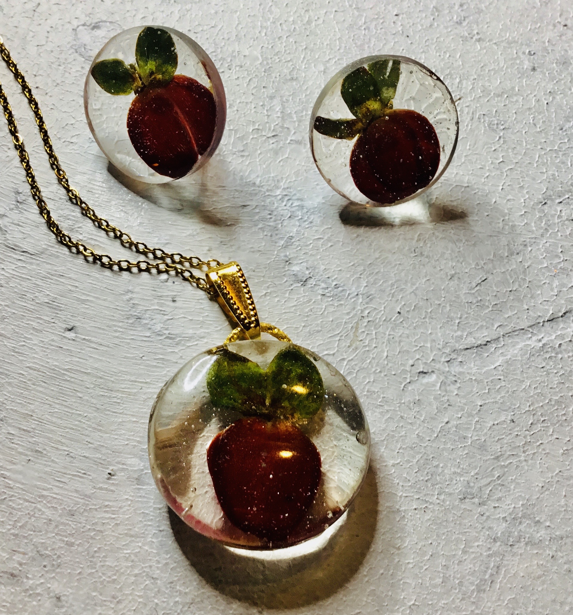 A jewelry set featuring real pressed cherry apple flowers encased in resin offers a unique blend of natural beauty and artisan craftsmanship. Each piece showcases the delicate allure of cherry apple blossoms, making it a thoughtful and distinctive gift for any occasion.