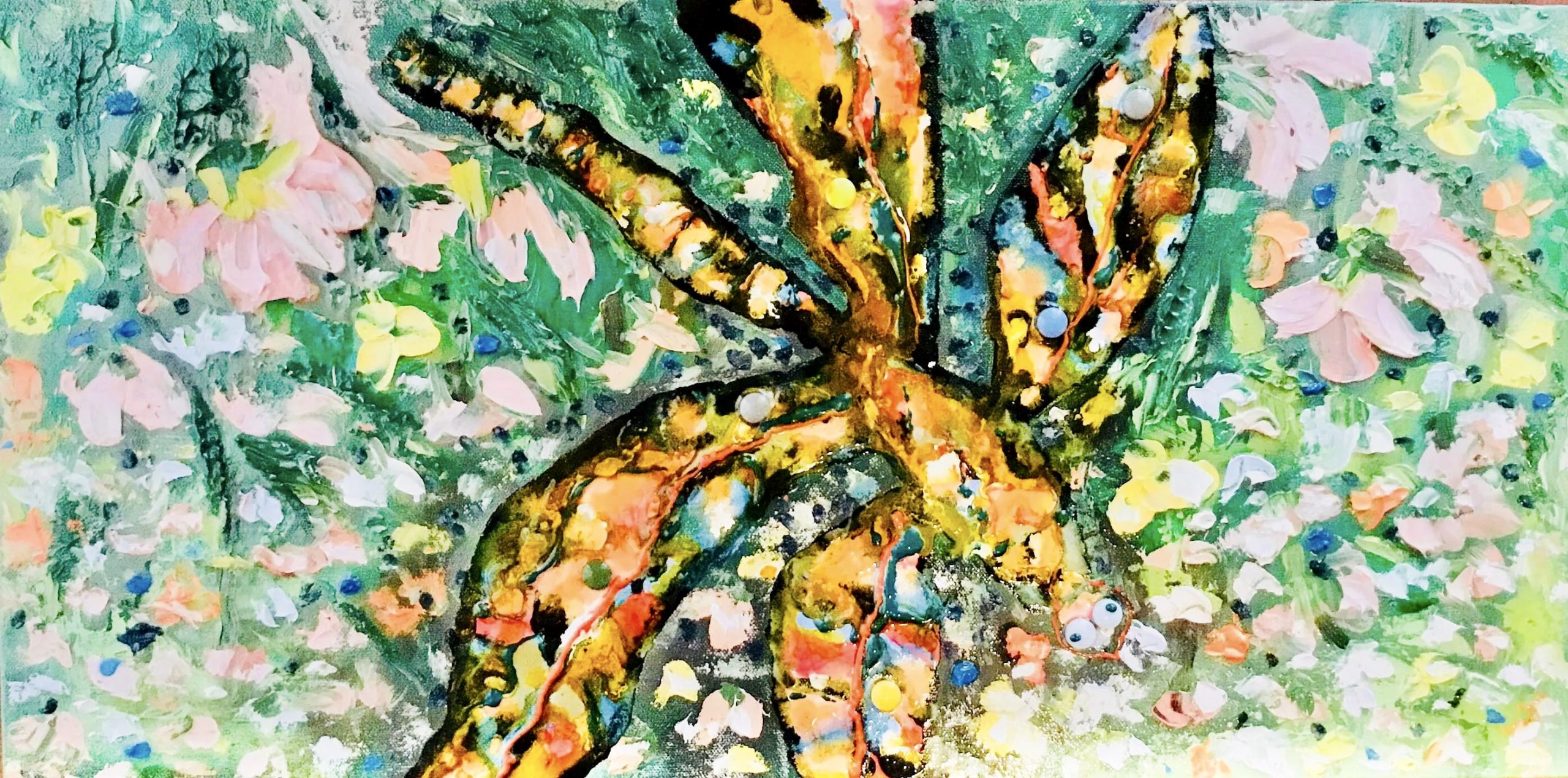 Dragonfly in the Fields” – A vibrant, one-of-a-kind mixed media abstract painting celebrating the delicate beauty of a dragonfly amidst a field of color and texture.