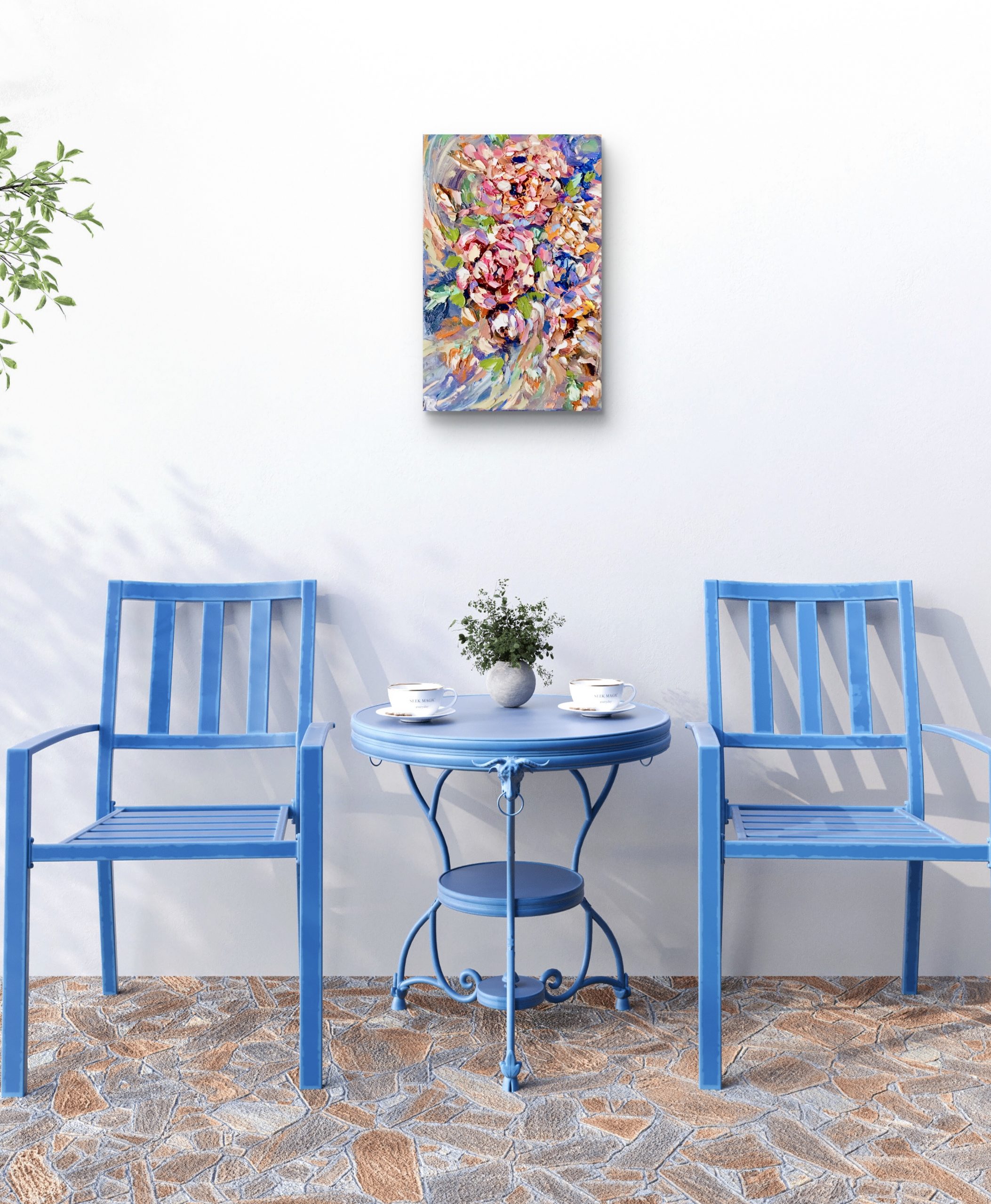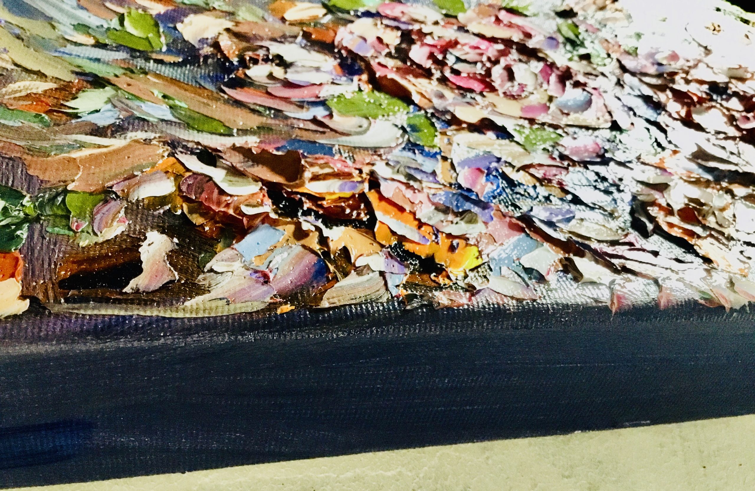 This original impasto oil painting captures the essence of a sunlit garden in full bloom. Featuring an expressive bouquet of bright, joyful flowers, each petal is sculpted with thick, textured brushstrokes that give the painting a lively 3D effect. Created using the impasto technique on a deep-edged gallery canvas, the artwork has a tactile, sculptural quality that draws the viewer in.