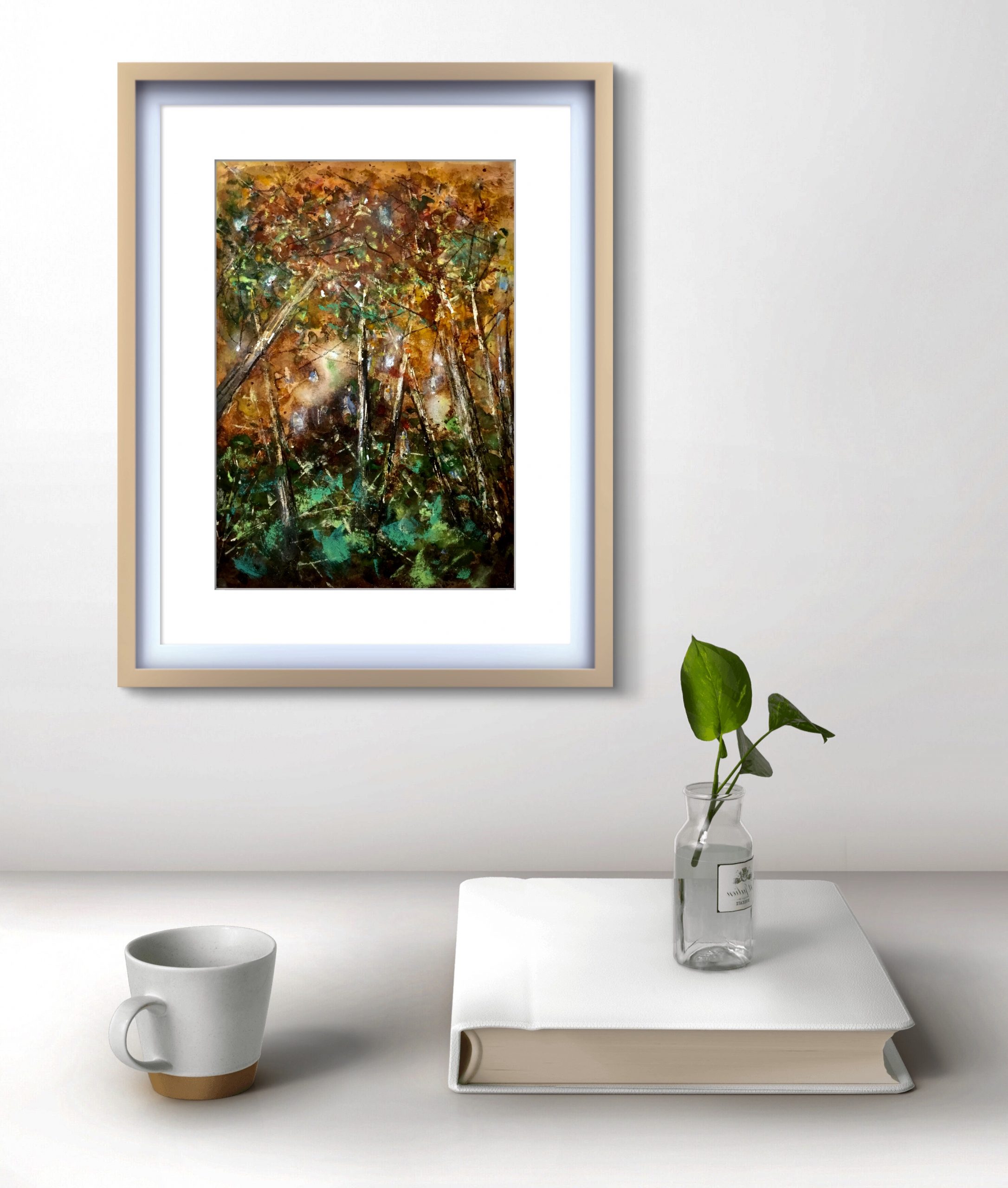 Golden Canopy is a captivating original watercolor painting that celebrates the glowing warmth and harmony of autumn. Painted on high-quality Arches 300 gsm watercolor paper (A4 size), this piece captures the fleeting beauty of nature as the forest transitions into rich amber and emerald tones.