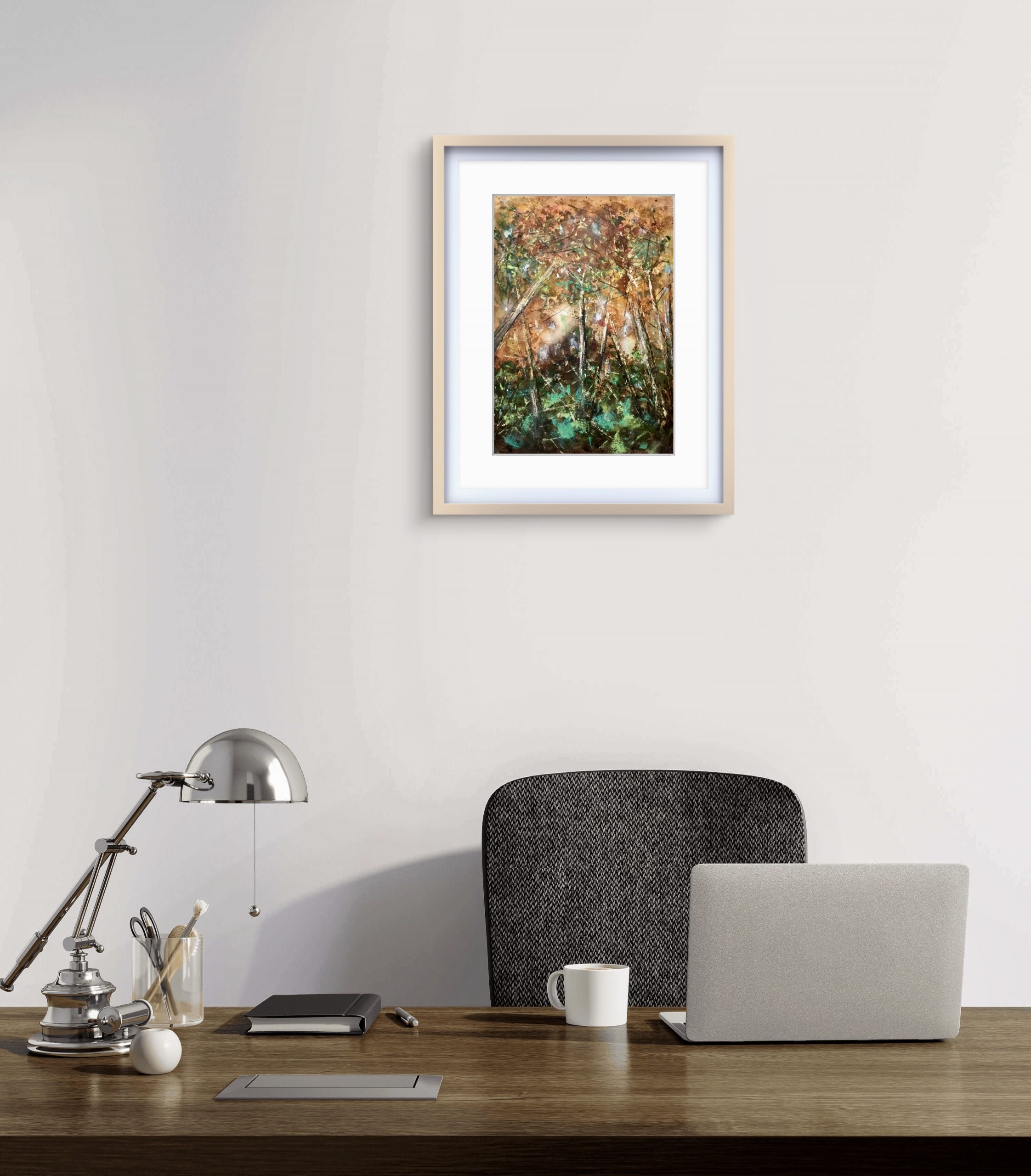 The painting is presented unframed to allow collectors the freedom to choose a frame that best suits their space. Shown here in a light wood frame as a styling example, Golden Canopy fits beautifully in both modern and classic interiors.