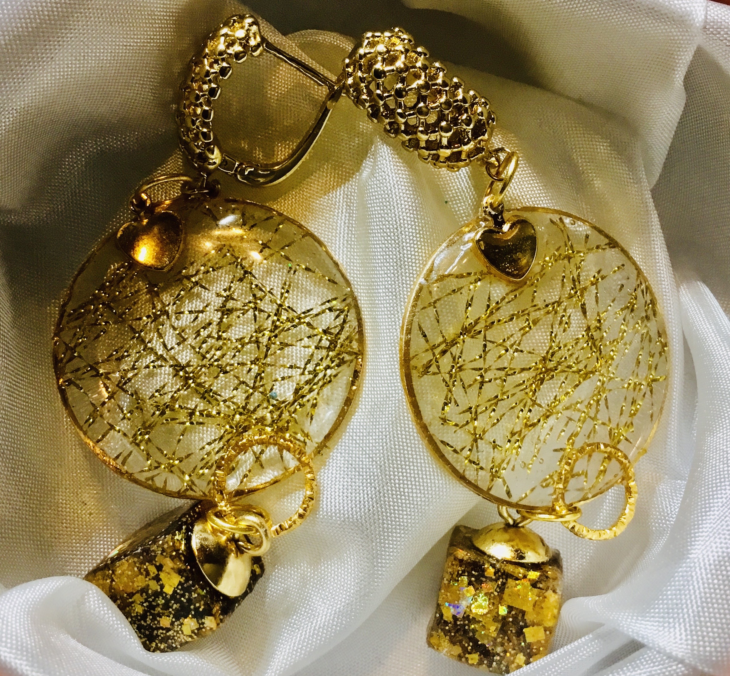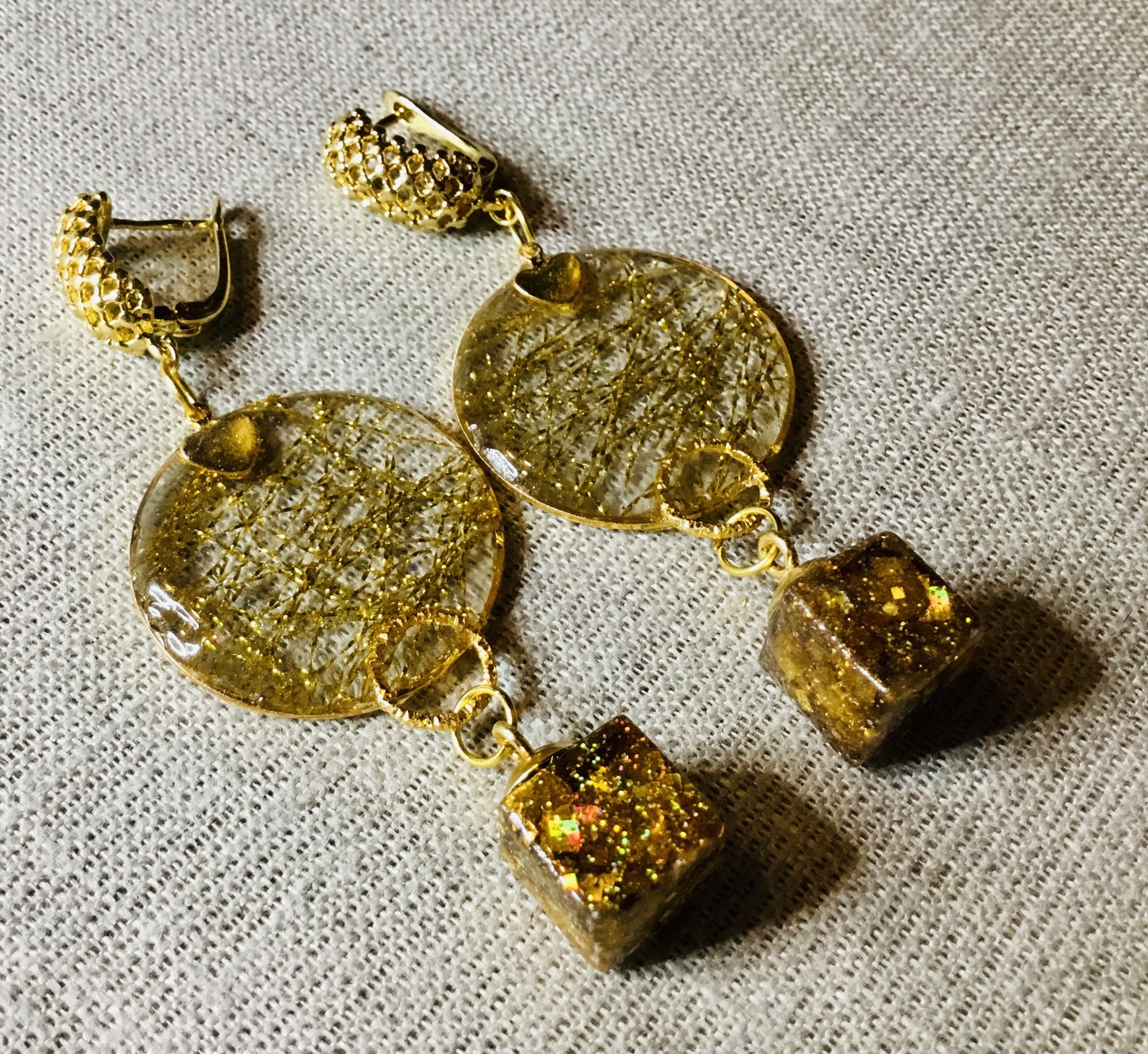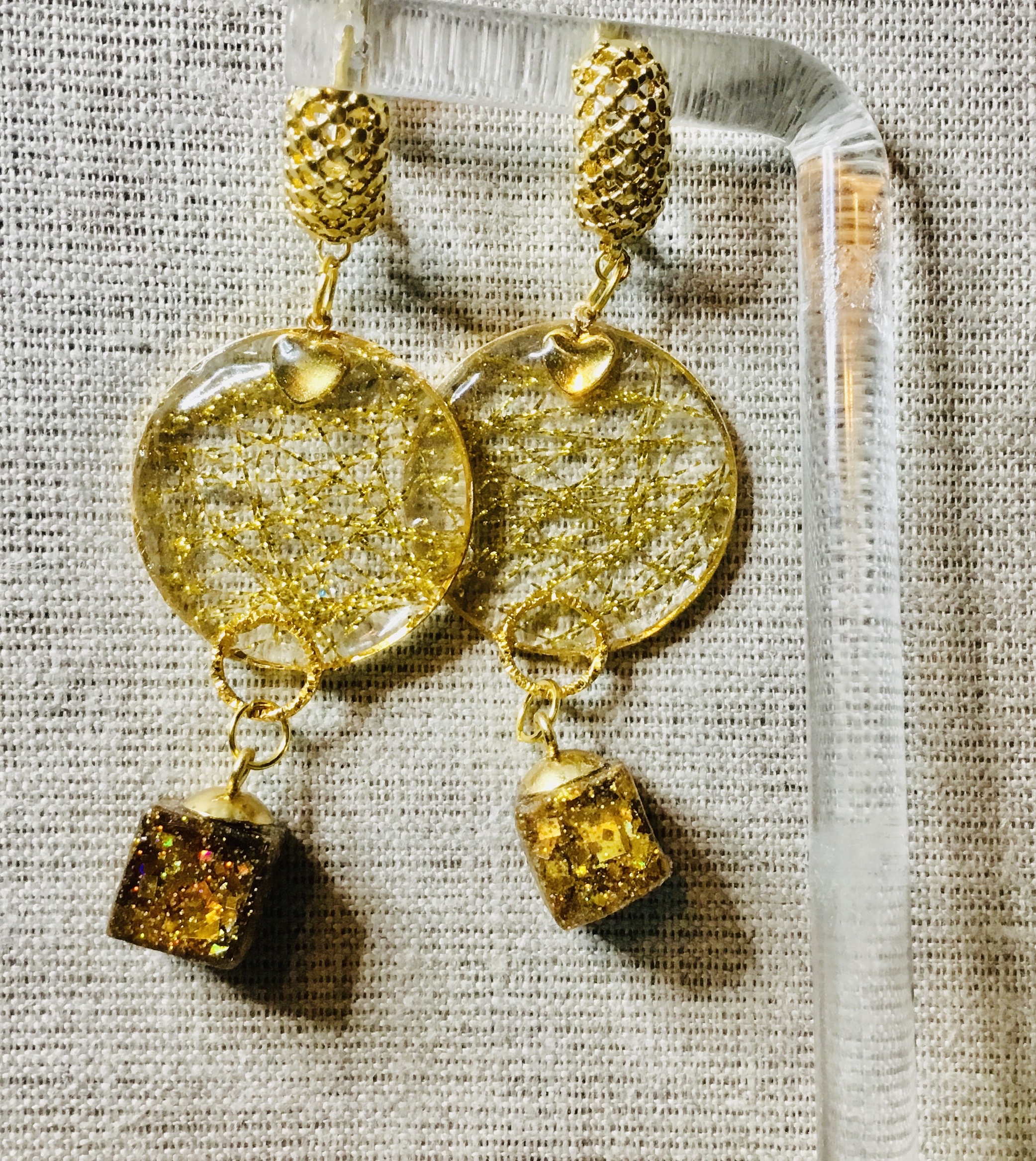 Golden heart glitters fantasy earrings,long drop earrings,cube,round and heart shape,unique handmade jewelry gifts for her,women jewelry.