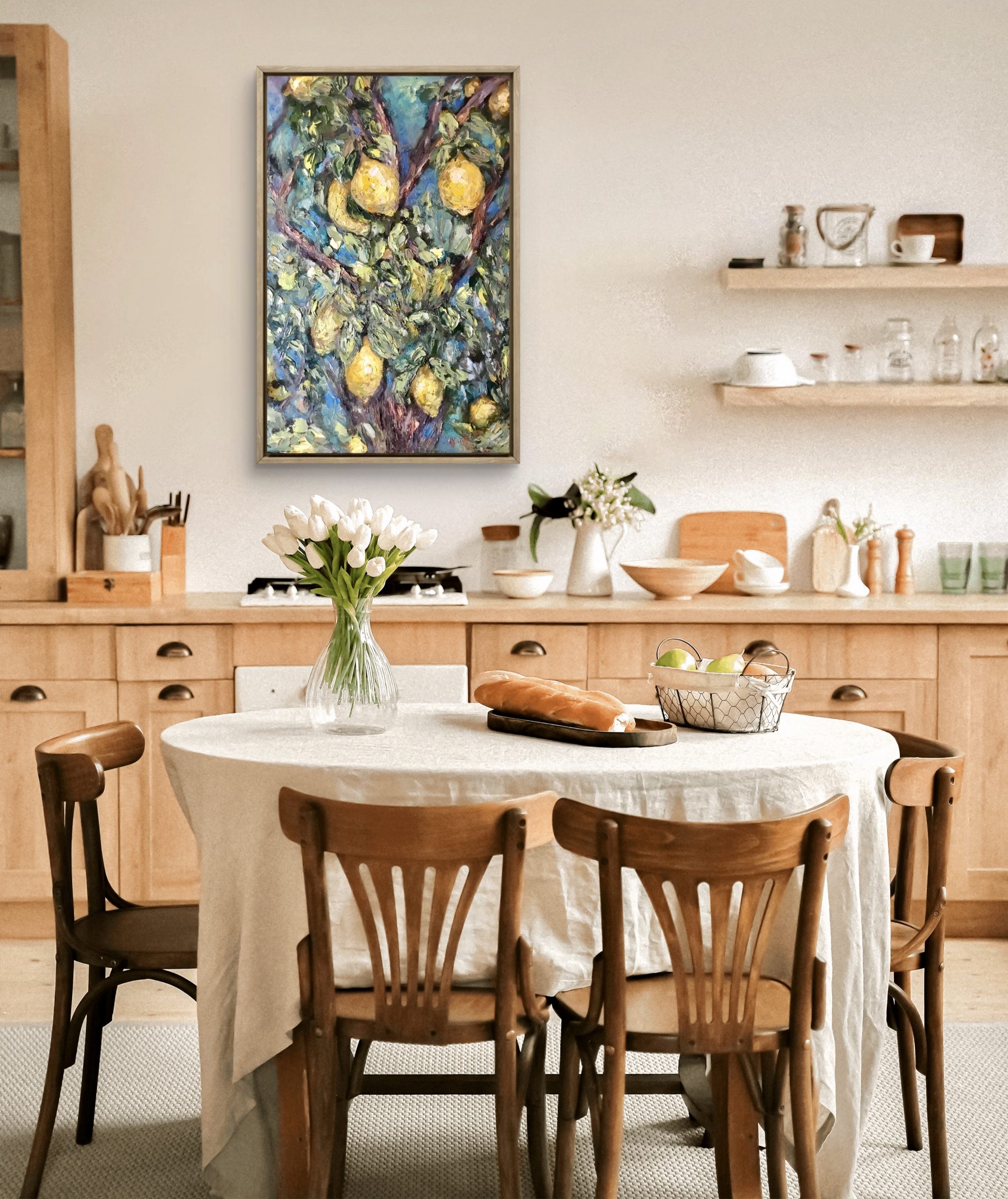 This piece is perfect for brightening up kitchens, dining rooms, and living spaces, adding a pop of color and an elegant, organic touch to your decor. Whether displayed on its own or as part of a gallery wall, the Lemon Tree painting makes a joyful statement that celebrates nature’s abundance.