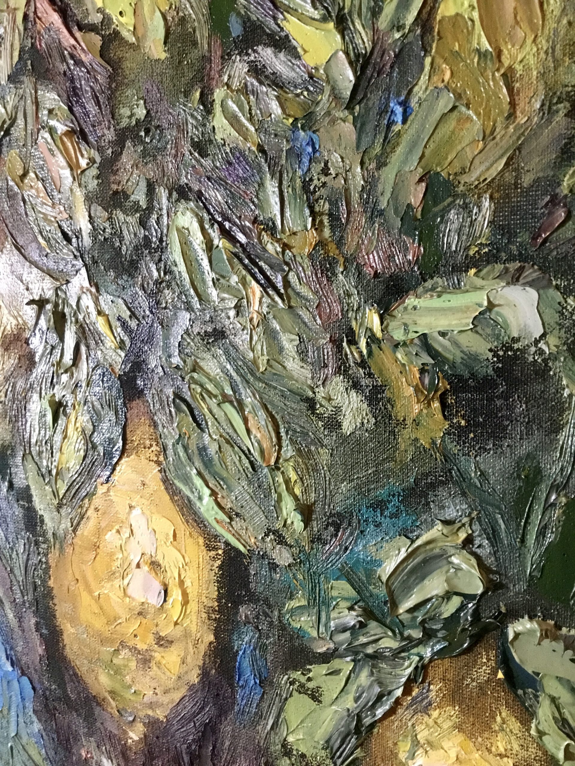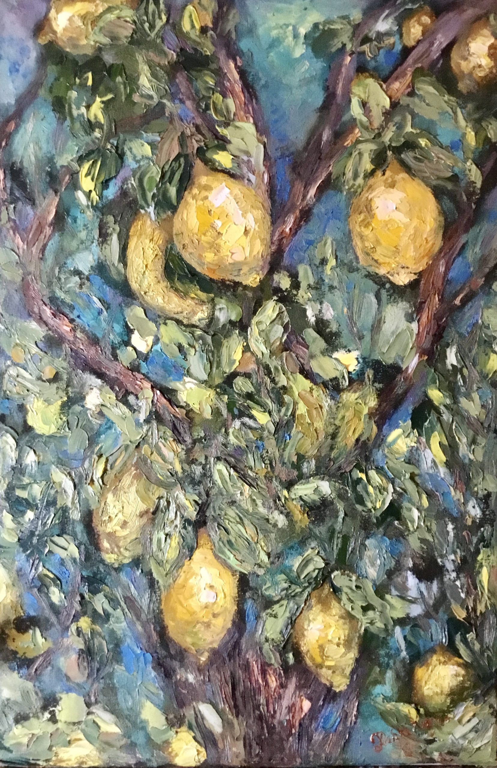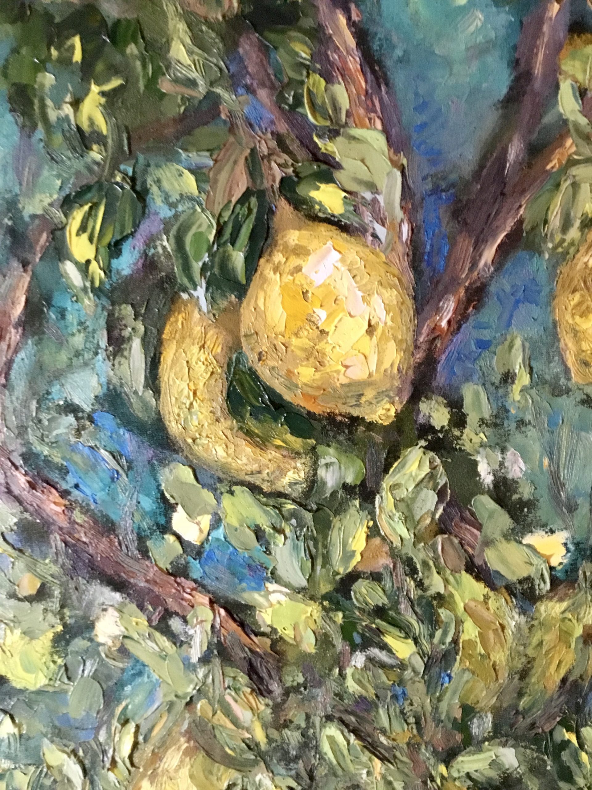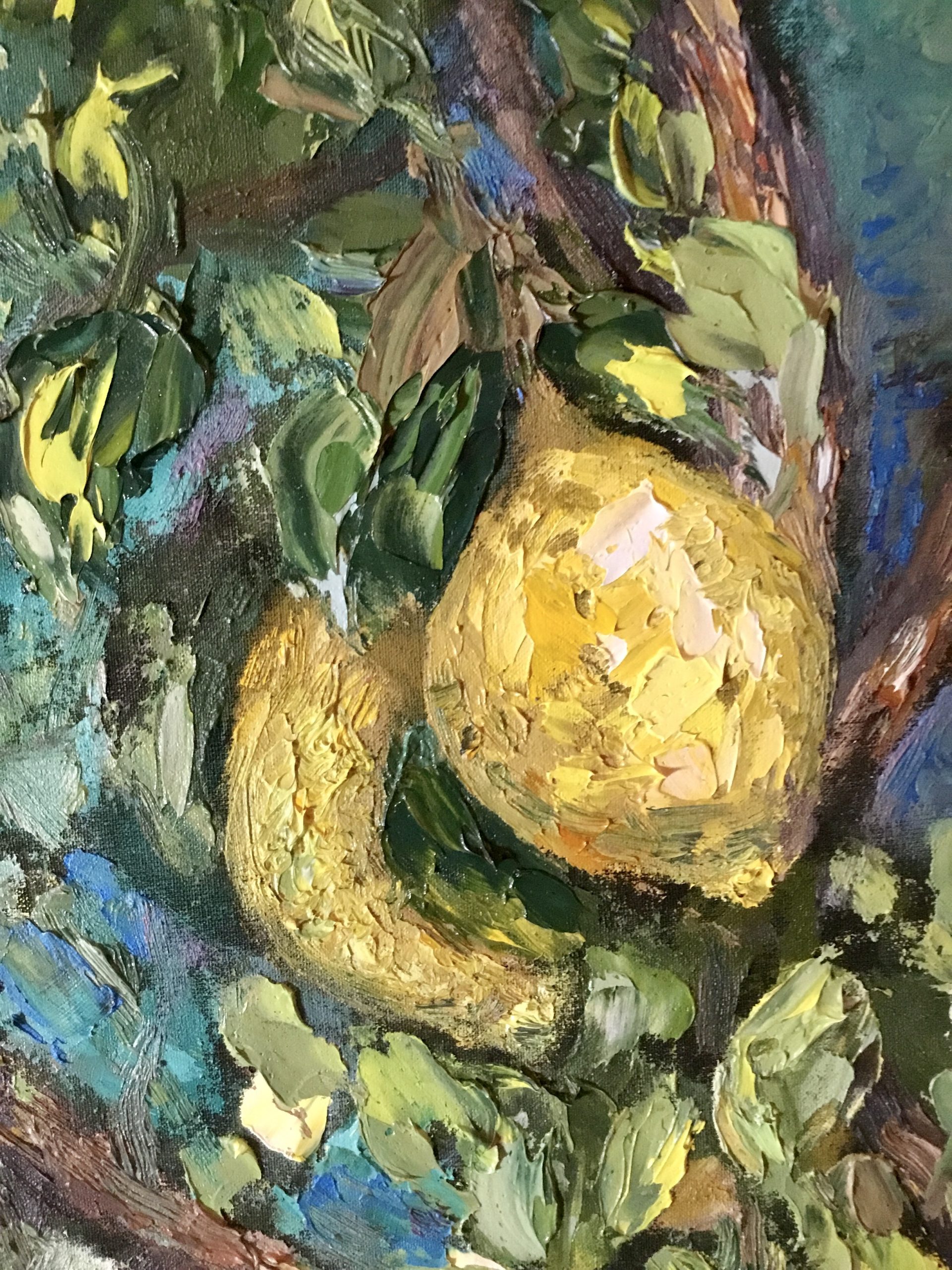 Bring the sunshine and natural beauty of the Mediterranean into your home with this original Lemon Tree oil painting. Featuring vivid yellow lemons nestled among lush green foliage, this artwork is painted with rich, textured impasto strokes that give it a lively and tactile feel. Each brushstroke adds depth and movement, creating an immersive scene that evokes the warmth of summer days and the scent of citrus groves.