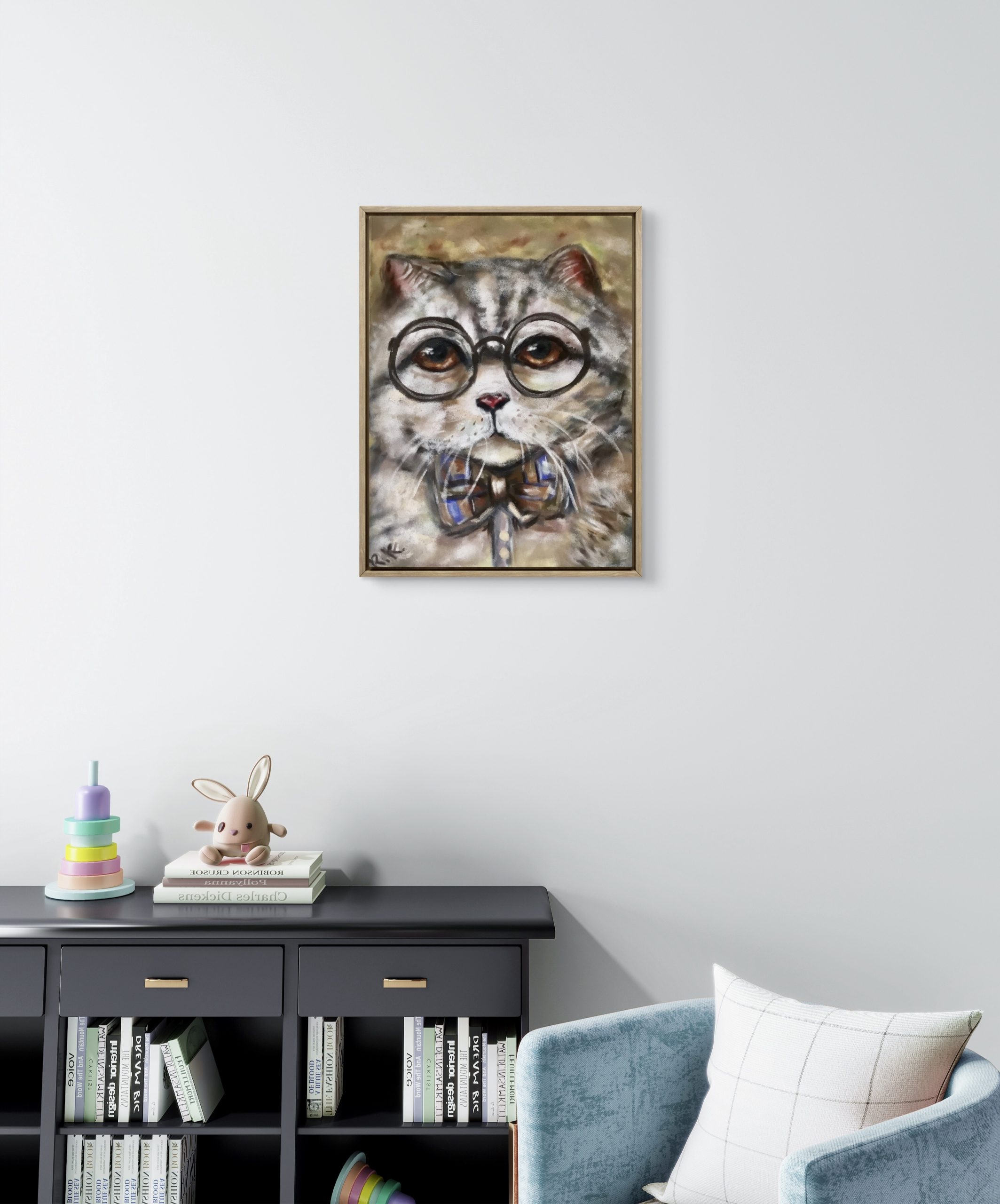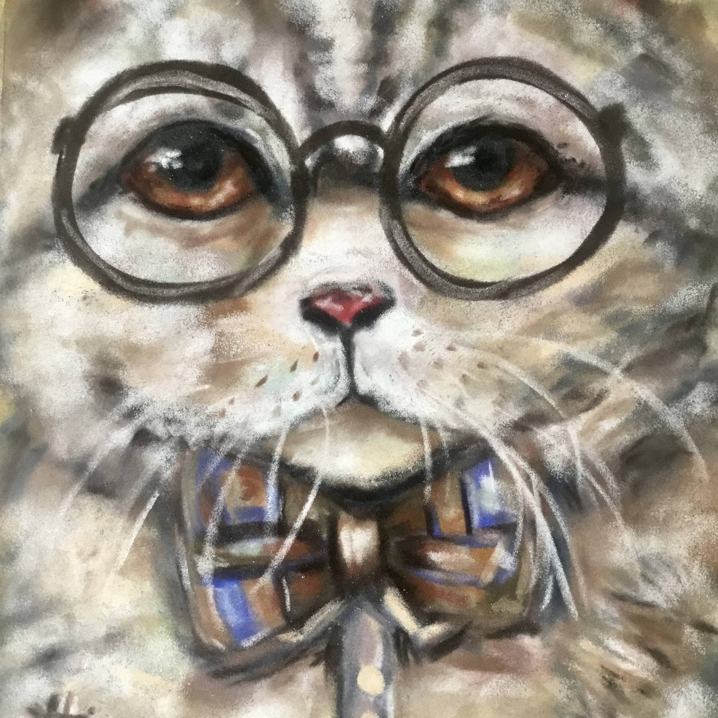 An original soft pastel painting titled “Leopold-Cat in Glasses” features a unique depiction of a cat wearing glasses. The artwork measures 8.4 x 12.6 inches, making it a distinctive piece for art collectors or cat enthusiasts.