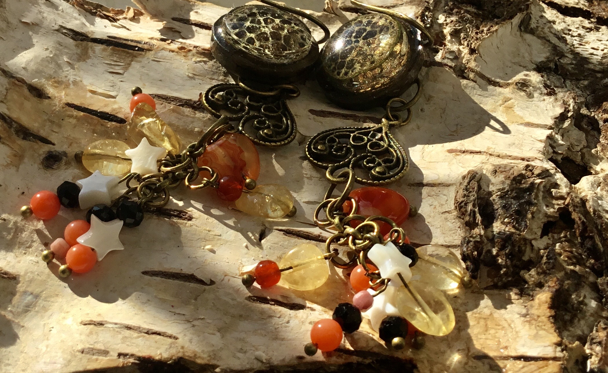 These earrings is a beautiful blend of vintage elegance and natural charm. The long lotus stem design gives them a graceful silhouette, while the combination of agate, coral, pearl shell, carnelian, and citrine adds a rich variety of colors and textures.