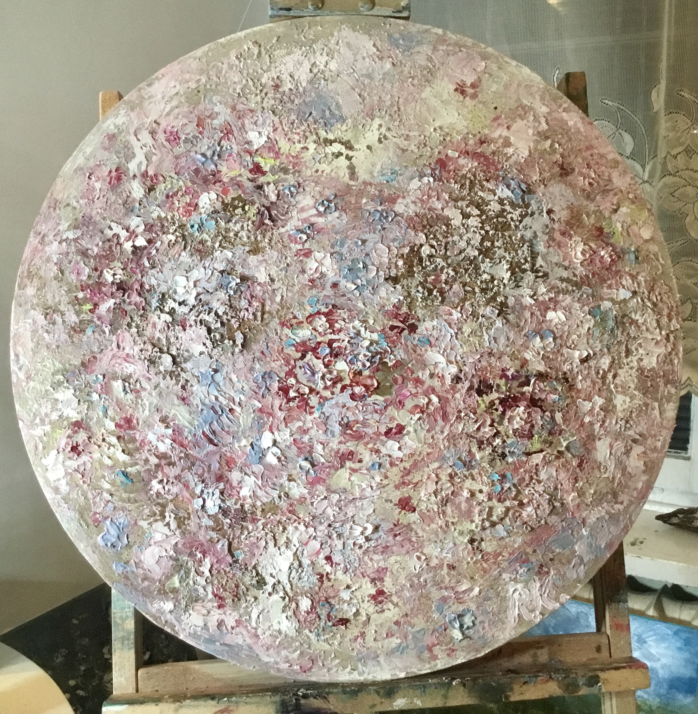 Heavy textured original oil painting on round canvas,