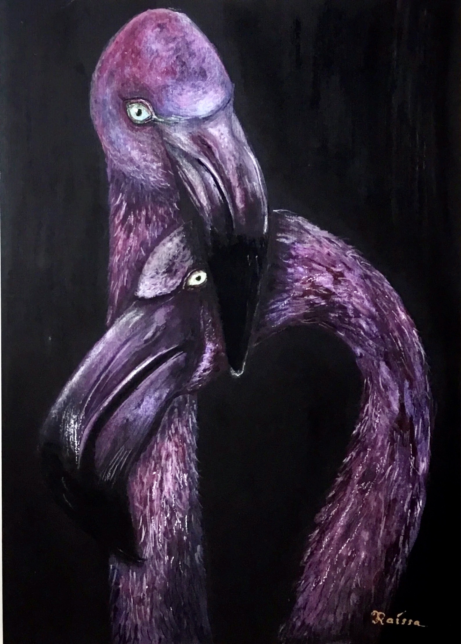 This one-of-a-kind artwork captures the delicate grace and tenderness of a pair of pink flamingos in love, their necks intertwined in a moment of serene connection. Set against a striking black paper background, the vibrant hues of their feathers stand out beautifully, creating a sense of depth, elegance, and emotion.