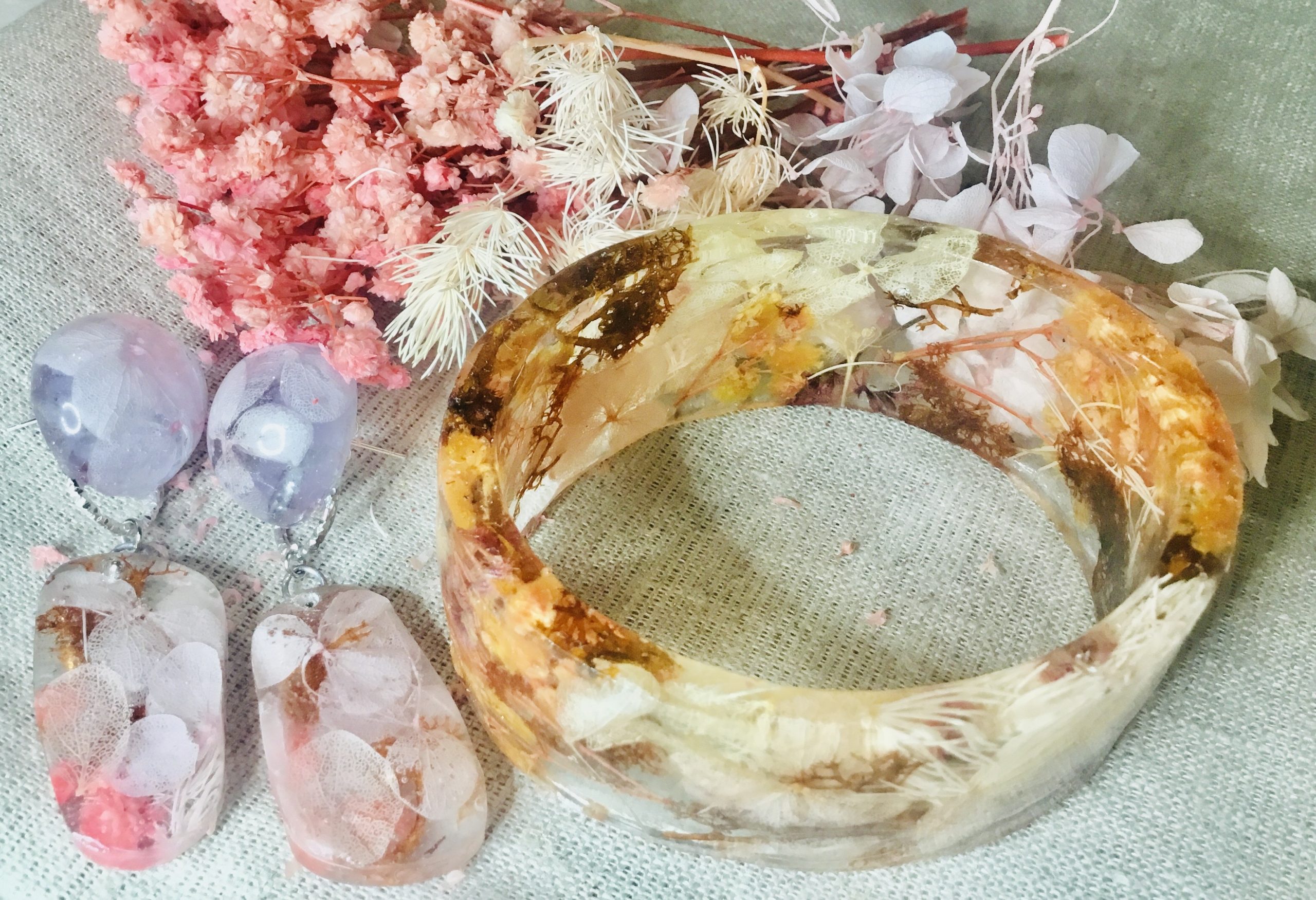 Handmade with care, this one-of-a-kind set includes a wide resin bangle and matching earrings, each carefully embedded with real dried flowers and botanical elements.