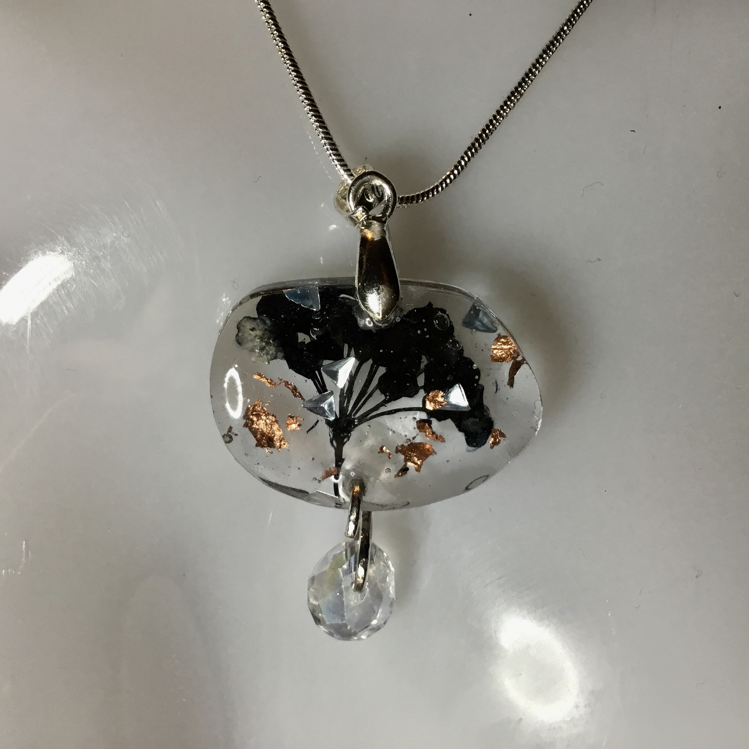Real black Japanese flowers & blue grey glitter,sterling 925 silver jewellery set,resin long drop uneven modern earrings and necklace,unique handmade jewellery set.