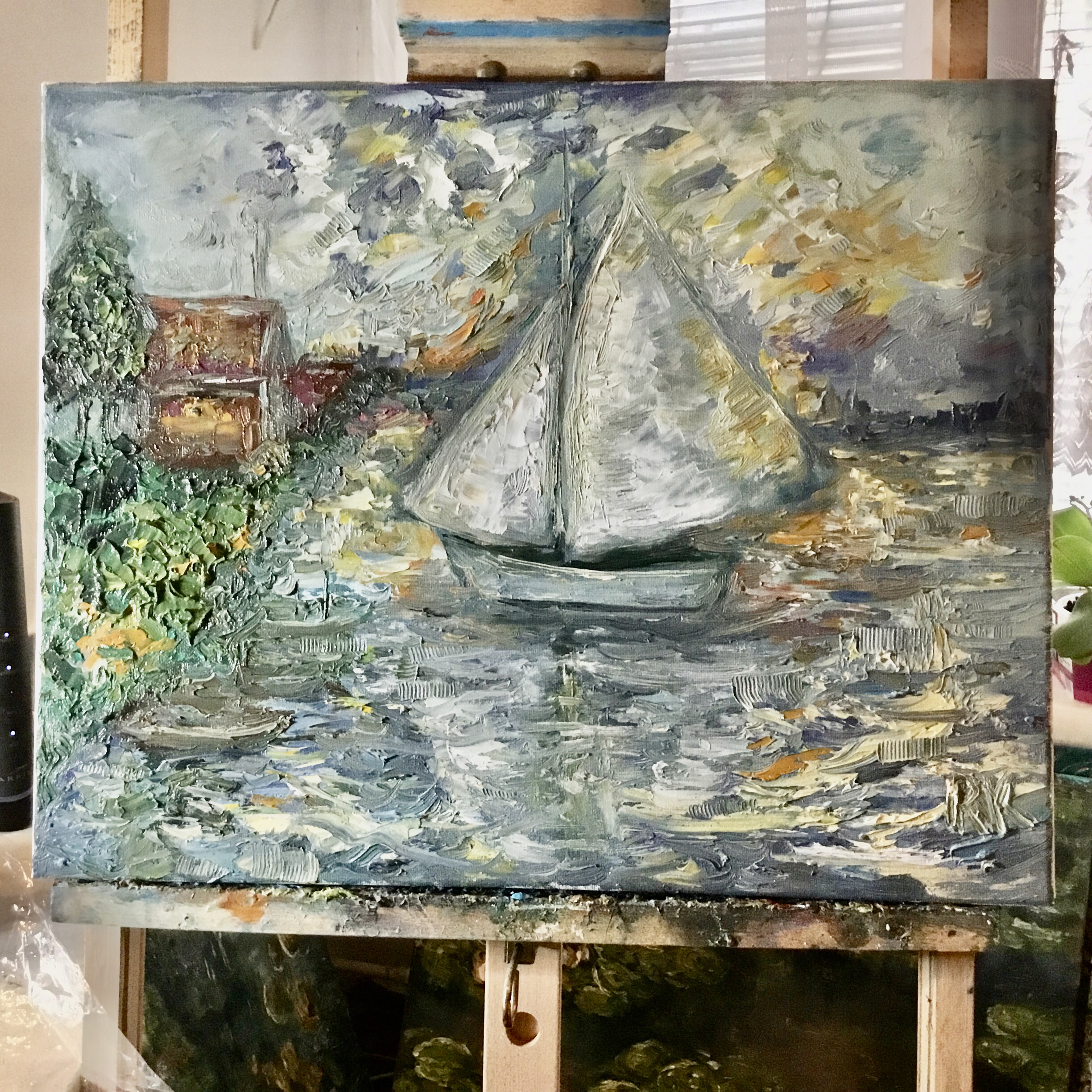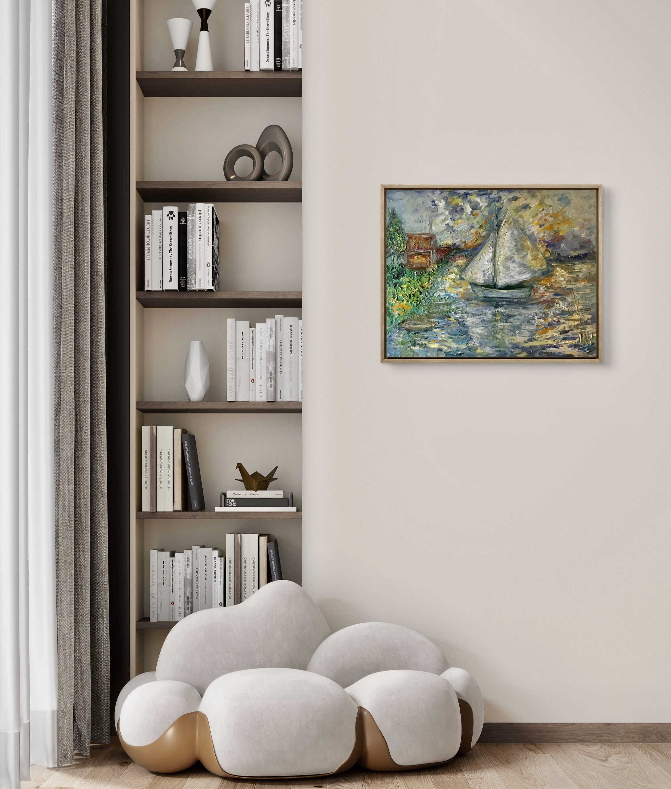 This artwork reflects the timeless influence of impressionism, evoking Monet-inspired atmospheres of light dancing across water. The sailboat becomes both subject and symbol—of freedom, peace, and timeless journeys.