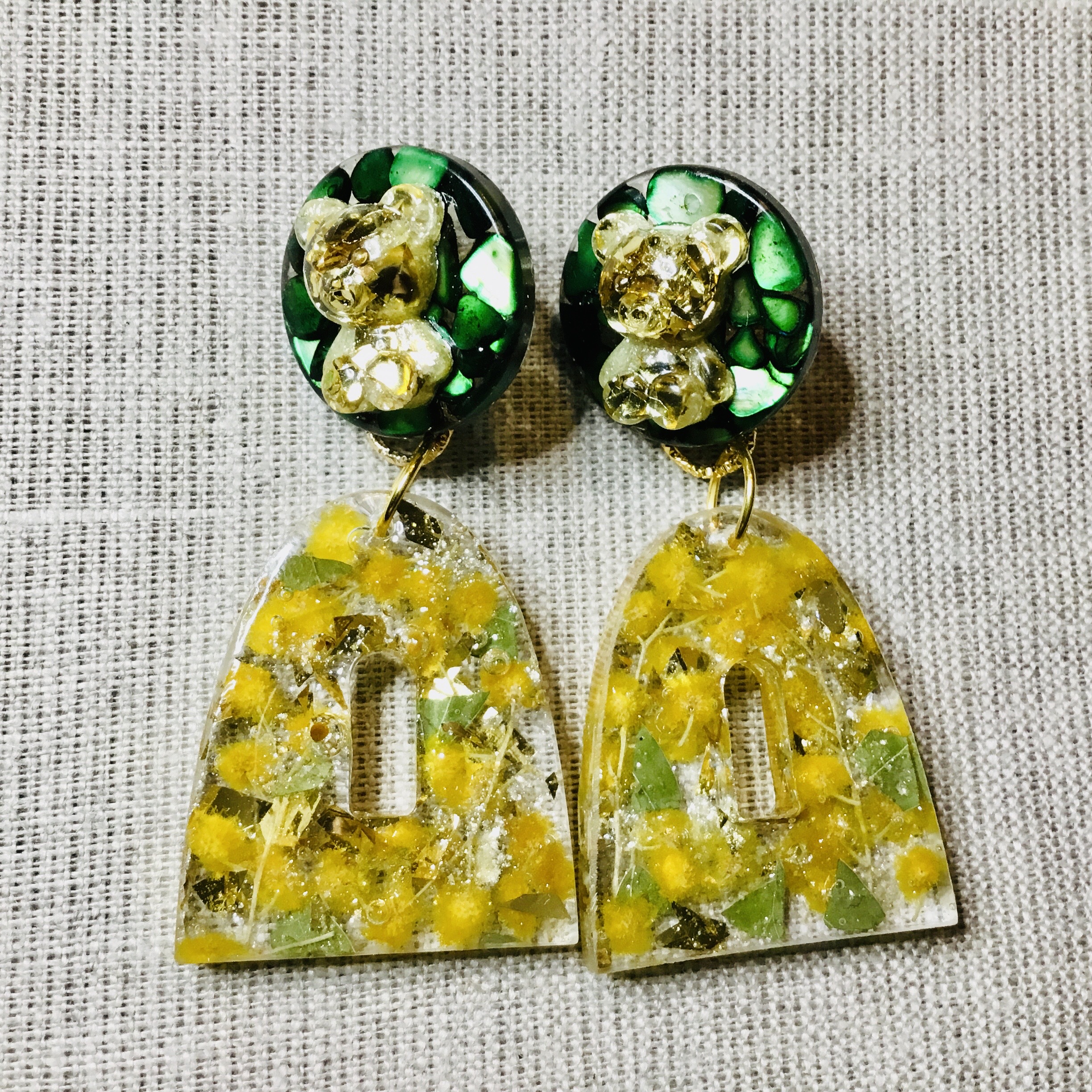 Teddy Bear and Real Mimosa Flowers Resin Jewelry Set, Handmade Earrings and Adjustable Bracelet, Nature Inspired Gift