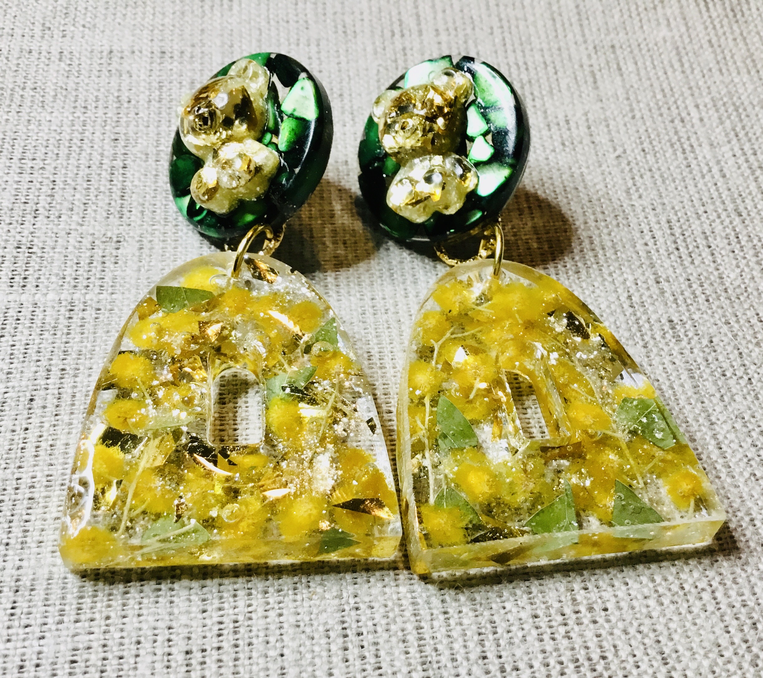 Materials: Real mimosa flowers, resin, stainless steel or silver-plated findings (depending on your choice)