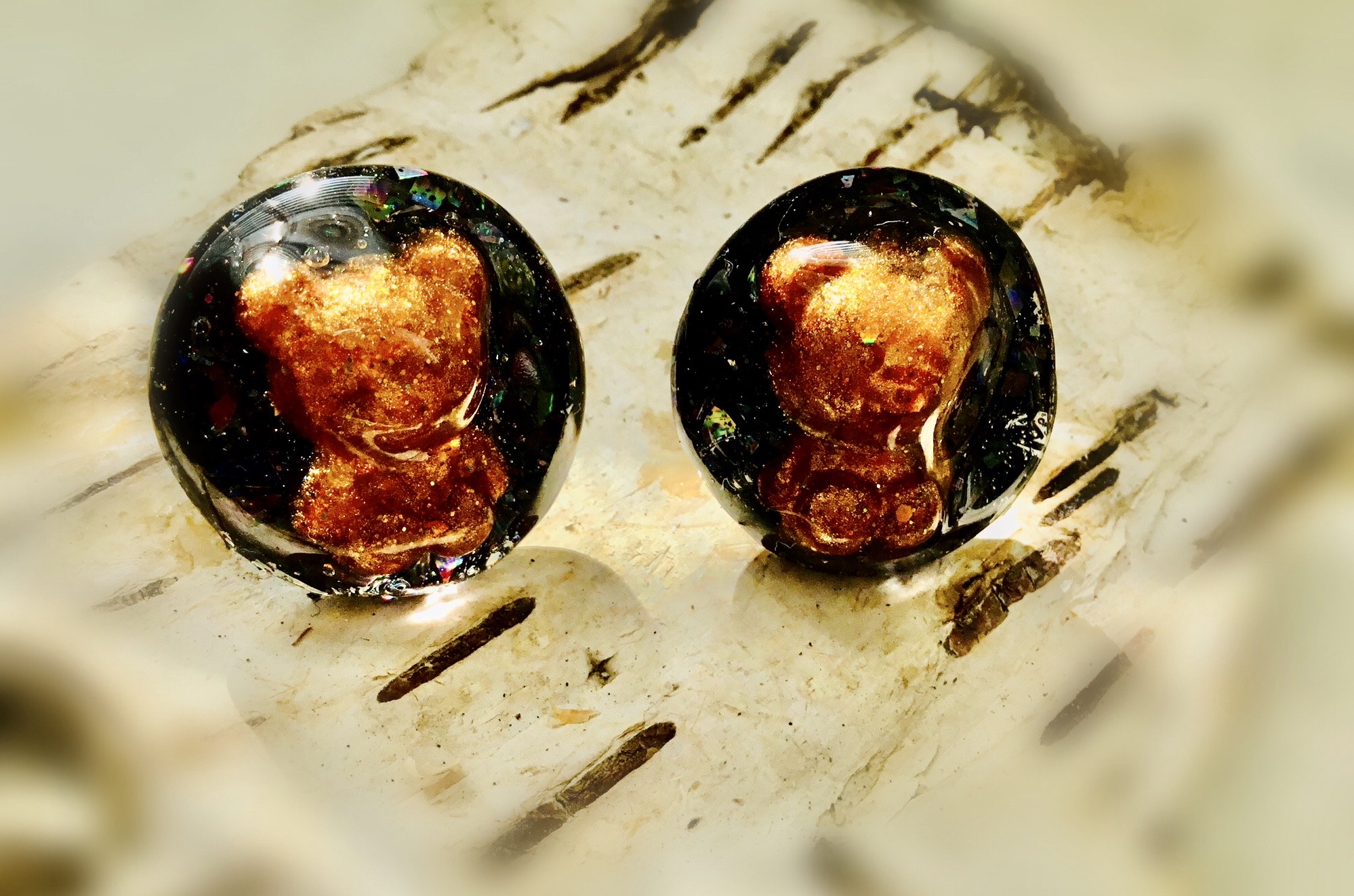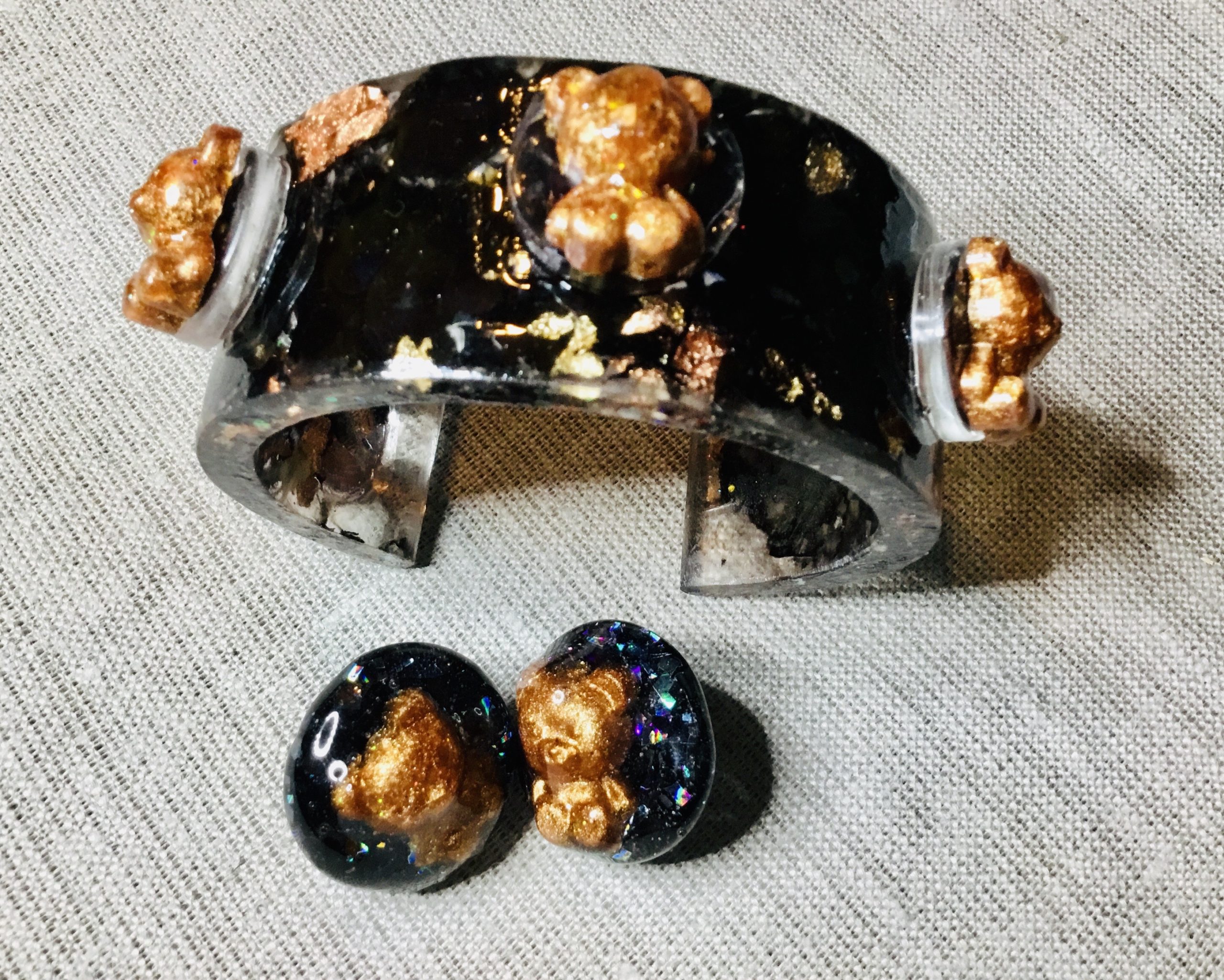 Teddy Bear Glitter Earrings and Black Roses Cuff Bangle Set — Unique Handmade Jewelry Gift at Ka-Gan.art