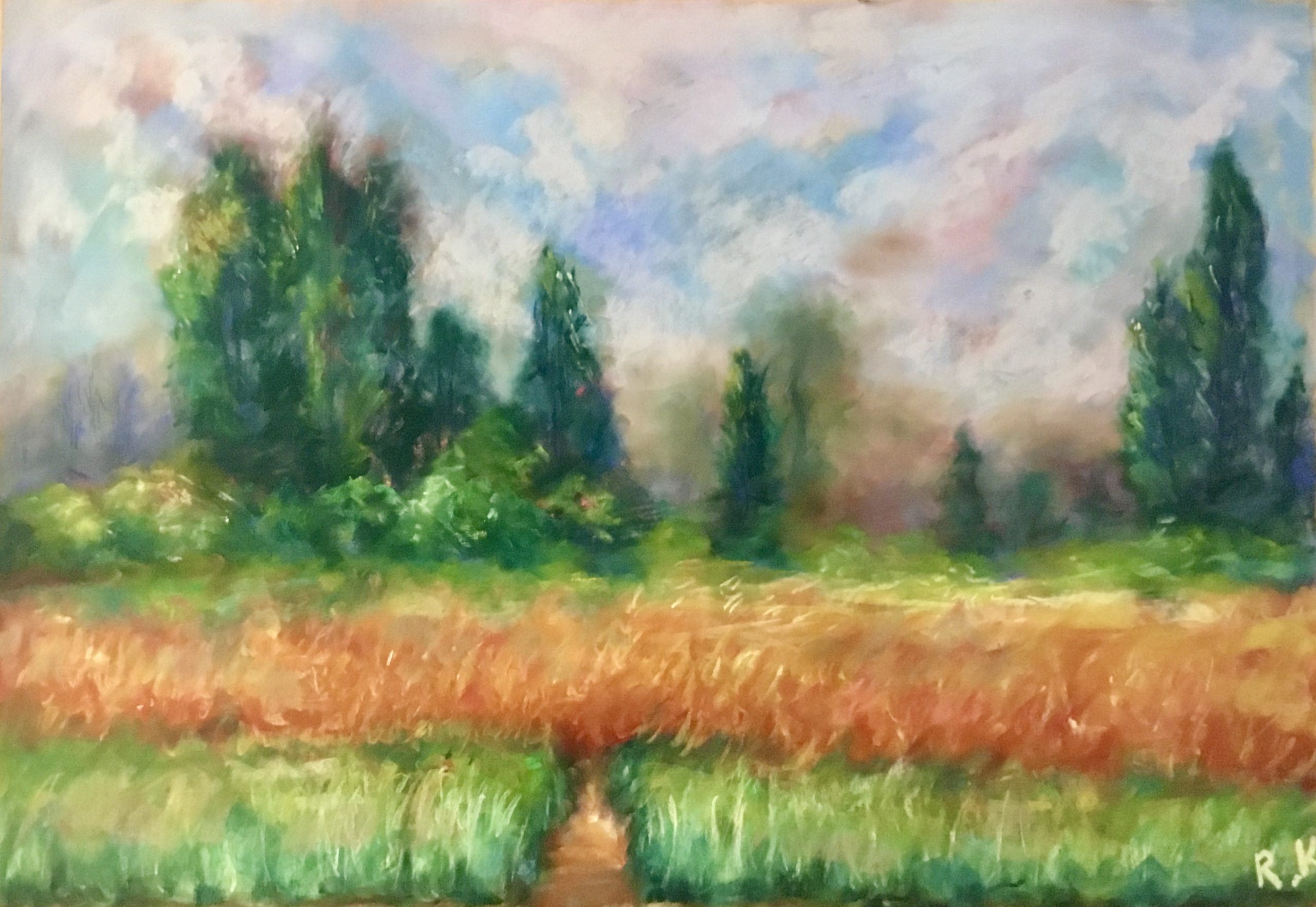 Wheat fields Monet inspired soft pastel painting on pastelmat.